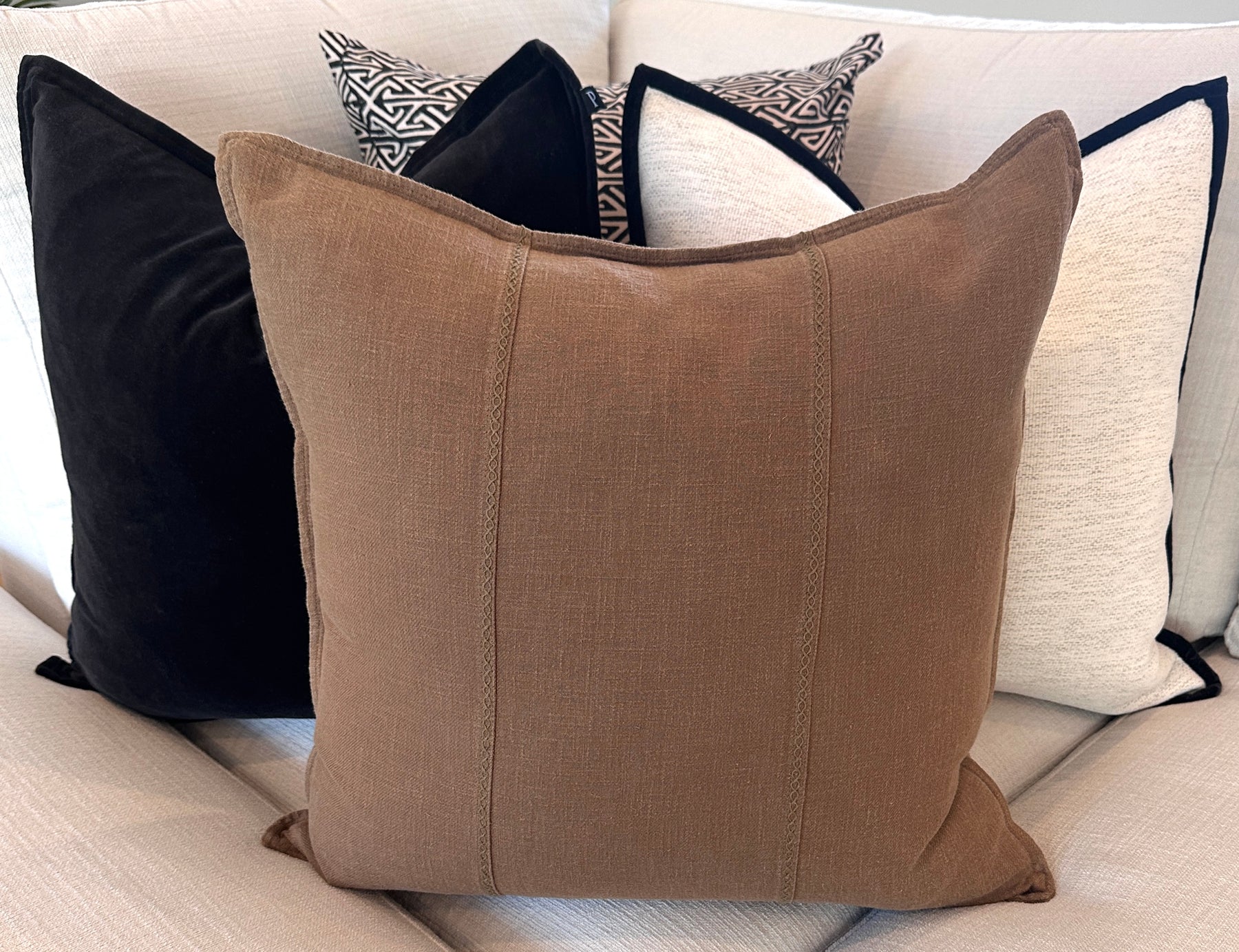 Elevate your surroundings with the elegant Eveleigh Stonewashed Linen Cushion. Woven from a premium linen-cotton blend and detailed with elegant double striped embroidery, it brings timeless texture and luxury to any room.