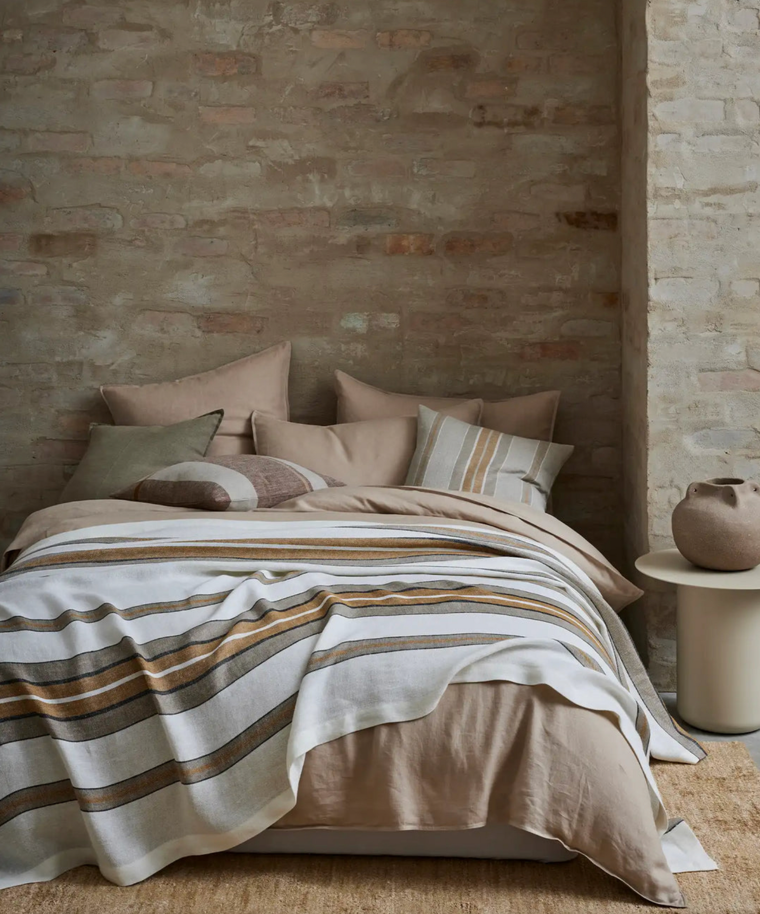 Available as a cushion or a throw, Franco is made from premium European linen. The Franco throw in Amber is a classic stripe, combining white, vibrant orange and nutmeg tones.